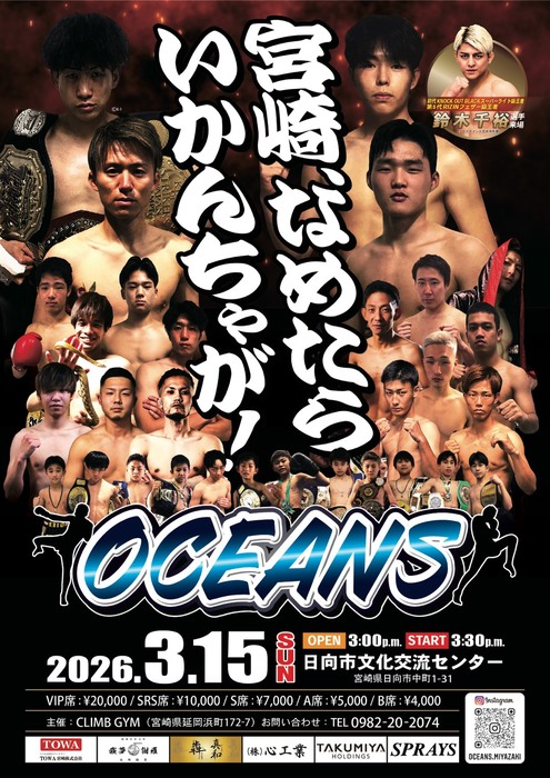 2026年3月15日(日)宮崎・日向市文化交流センターで開催される宮崎県発、宮崎県唯一のプロキックボクシングイベント『OCEANS』の全対戦カードが発表された。