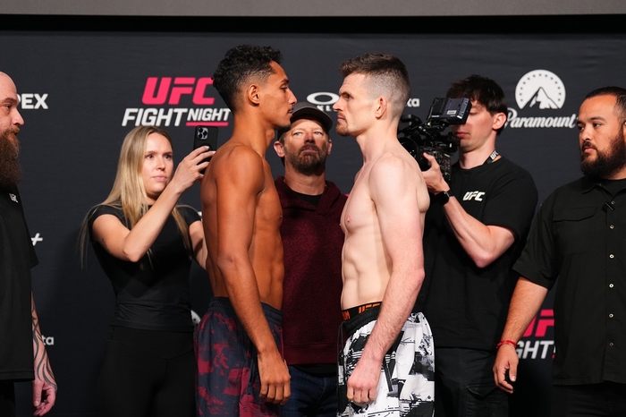 英国のハードウィックは31歳。UFC戦績0勝1敗。キャリアでは13勝4敗1分(3KO、4一本勝ち)。元ケージウォーリアーズ・フェザー級王者で、キックボクシングが主体のスタイル。昨年9月のフランス大会で、ランカーのファレス・ジアムが家族に不幸があり急遽欠場。直前のため、減量が間に合う階級下のハードウィックにオファーがあり、ライト級でUFC2勝1敗のカウエ・フェルナンデシュとの対戦が実現した。しかし、試合ではフェルナンデシュの強烈なカーフキックにより、2分少々で両足を効かせられてしまいKO負け。何もさせてもらえなかった。今回の試合に向けたトレーニングついて聞かれた際には、自虐的に「ローキックの防御」と答えている。