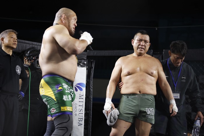 「ずっとプロレスラーになりたくて、色々あってプロレスラーの道を諦めて、警察官になりました。そんな時、同い年でPRIDEで、イゴール・ボブチャンチンとか、ムリーロ・ニンジャとか、シュルトとか、世界の怪物と戦っている小路さんを羨ましく、そして正直言うと妬ましく思っていました。36歳の時にボンサイ柔術と出会い、MMAデビューしました。その頃、憧れの小路さんは、三崎さんと引退試合をして、マットを去りました。自分の過去が、小路さんと向き合っていて、浄化されるのを感じました。1秒でも長く小路さんと向き合っていたかったけど、自分の足も限界で、最後は寝技に行ってしまいました。本当は最後まで殴り合いたかったです。