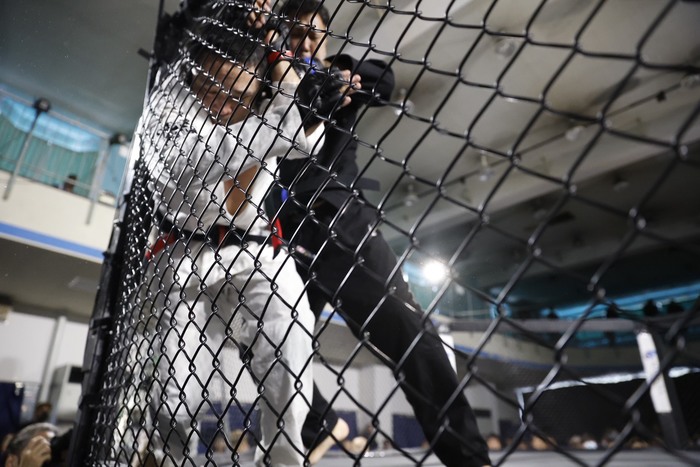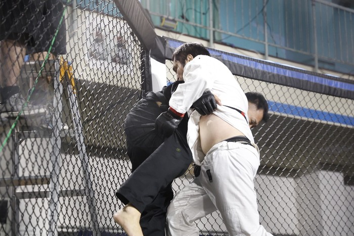 組んだ関澤。バックに回ろうとする。投げで崩してケージに押し込んだ関澤。四つでお互い相手の帯を取る。西村が足を掛けてテイクダウン。