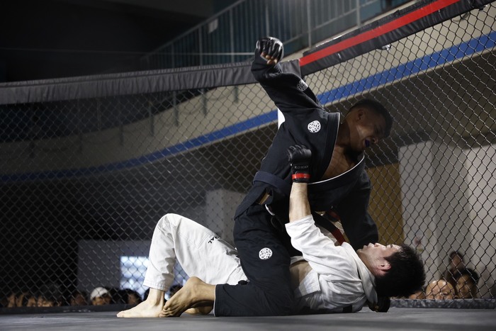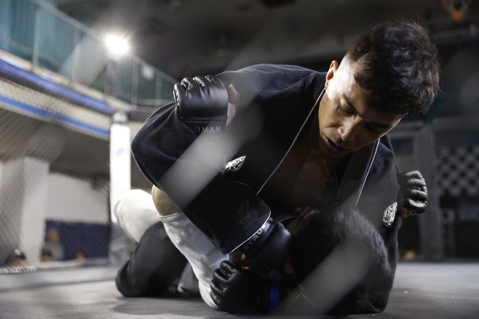 オーソのメネギンにサウスポーの竹本。引き込んだメネギン。袖を掴むが、竹本が持ち上げてケージ際まで移動する。三角を狙っていくメネギン。竹本はパウンドを一発入れるが、メネギンは下から両袖を掴む。横返しでスイープしてマウントを取ったメネギン。左腕で枕を取って、右腕でパウンドを入れる。