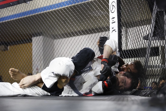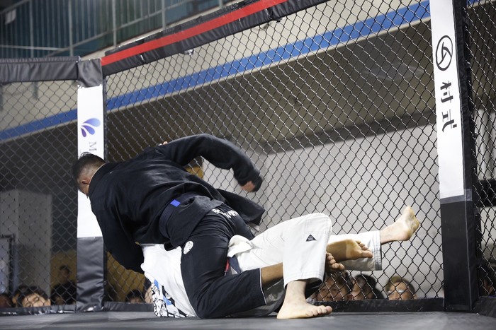 体を起こしたメネギン。ハーフにした竹本だが、メネギンが袖を持ちながらヒジを顔面に入れる。足を抜いてサイドに出たメネギン。ニーオンからマウントに移行する。5分経過。マウントからアメリカーナを狙ったメネギンだが外れる。マウントで固められる。ハーフに戻した竹本。メネギンの左足に二重絡みで足を絡める。動きがなくなり、レフェリーがブレイク。
