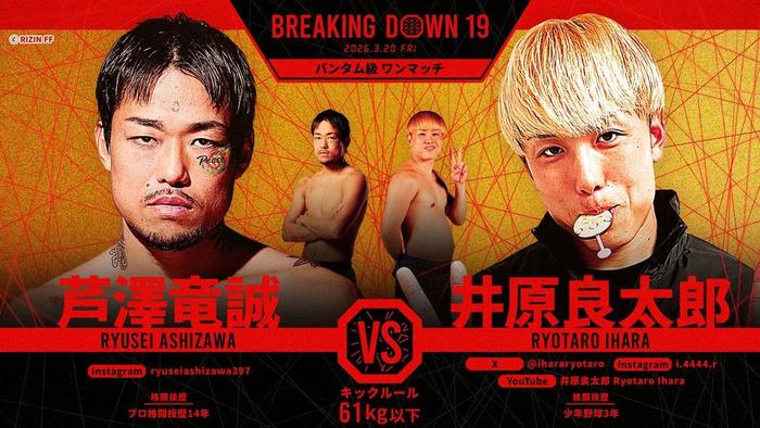 2026年3月20日(金)愛知・IGアリーナ『BreakingDown 19』のメインイベントで、対戦が決定したバンタム級ワンマッチ・キックルールの井原良太郎vs.芦澤竜誠。