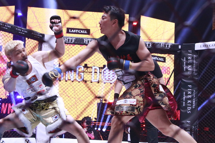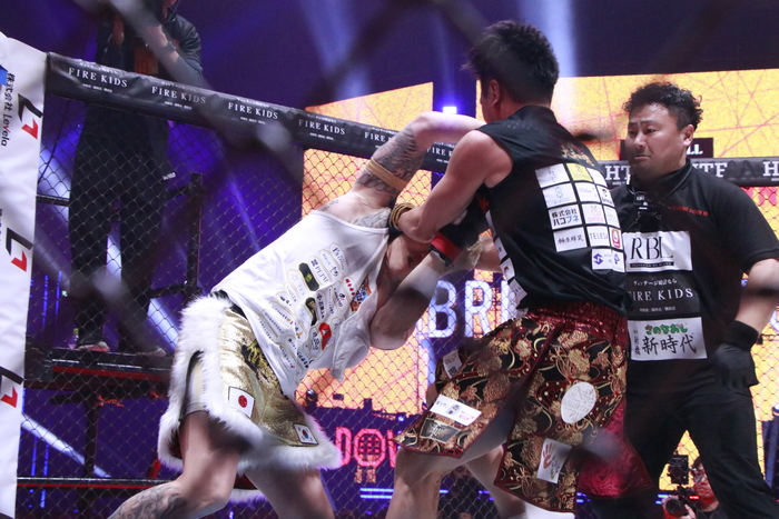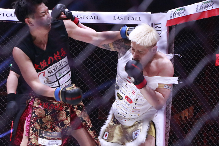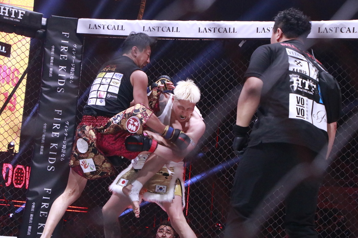 転倒して倒れると起き上がるのに時間がかかる傾奇者。村長がフックをぶん回し、最後まで攻めて判定5-0の勝利を収めた。