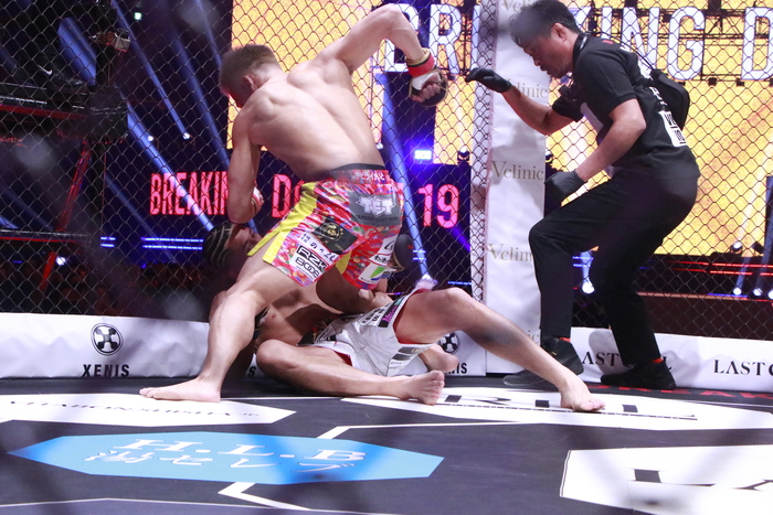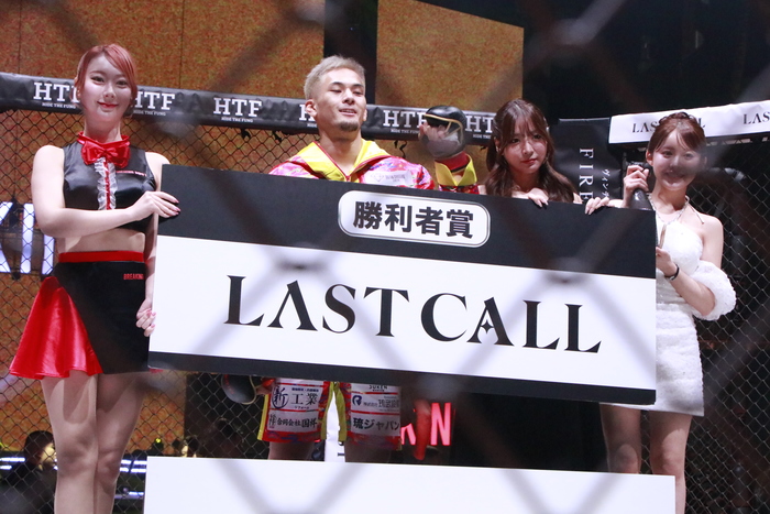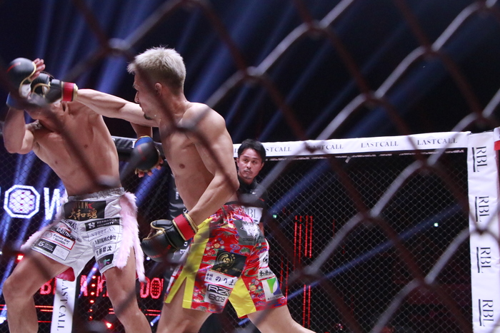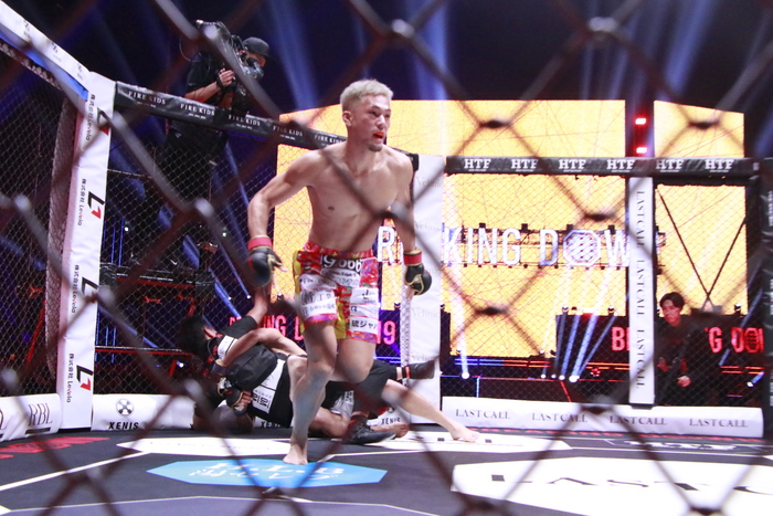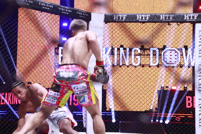 開始と同時に前へ出た太陽は綺麗なワンツーを打ち、右ストレートを打ち抜くと平石がダウン。すかさずパウンドを連打し、7秒でのTKO勝ちとなった。