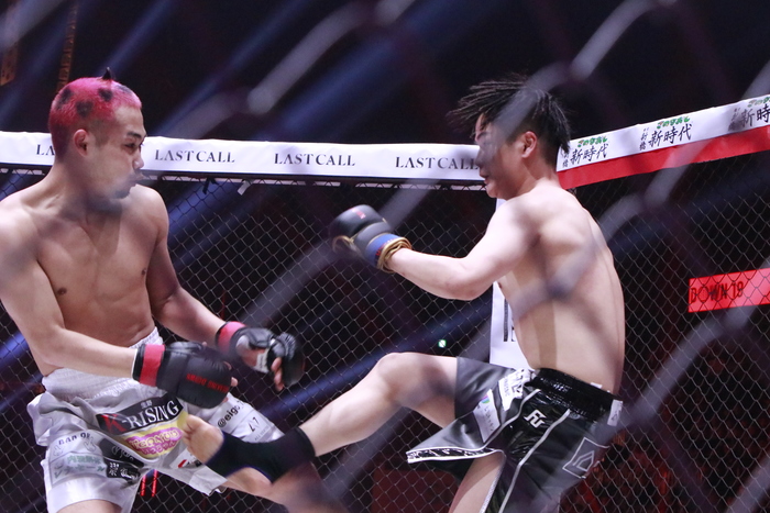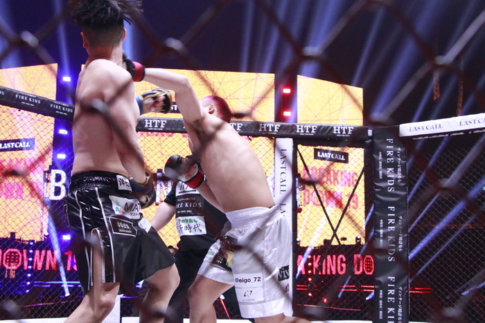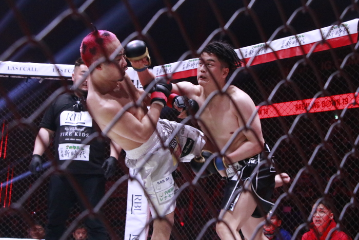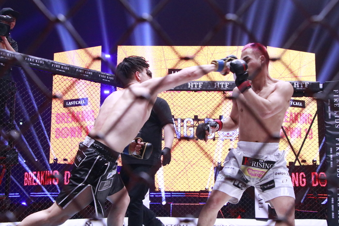 延長戦になるとボクも右ミドルを蹴り始め、距離をつかんできたかパンチも当たり始める。それでもボクが左ミドルからの左右フックで前へ出ていき、攻める姿勢を見せ続けた。