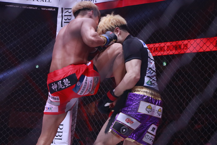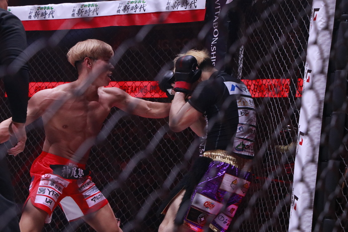 序盤からフルスイングの左右フックで飛ばしていく大胸筋。10人ニキはケージを背にしながら打ち返すが、大胸筋の回転が止まらない。ラスト10秒、大胸筋がさらにフルスロットルの左右フック連打、10人ニキは防戦一方に。