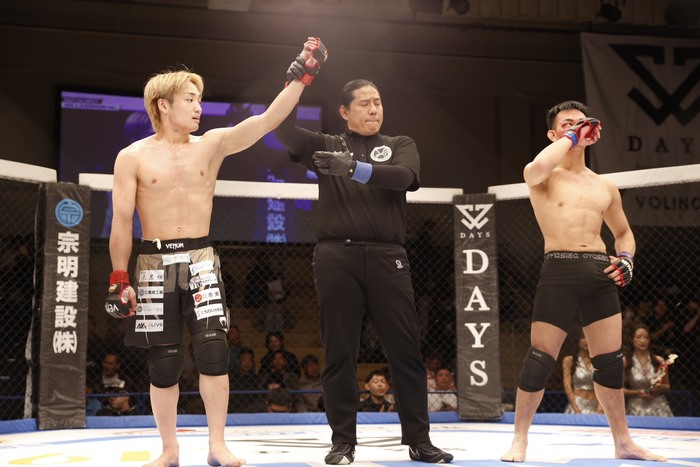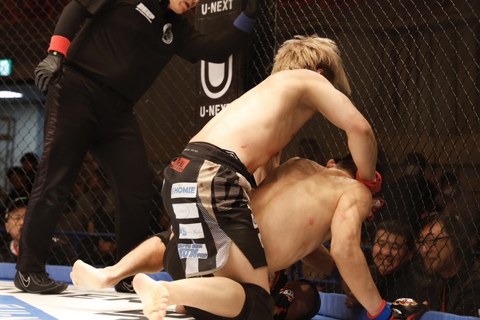 2R、低い構えの河島に高尾は左ミドル。しかし詰める河島がシングルレッグ。切った高尾になおも河島はシングルレッグ。片足立ちでこつこつ鉄槌の高尾は、組みを切ってバックに。リアネイキドチョーク狙いも最後に河島が外して立ってゴング。
