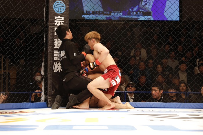 1R、日比野が右を振ってケージに詰めてテイクダウン狙い。ボディロックからヒザを突いた日比野だが、山本がヒザをマットに着いたグラウンド状態で顔面に入り中断。