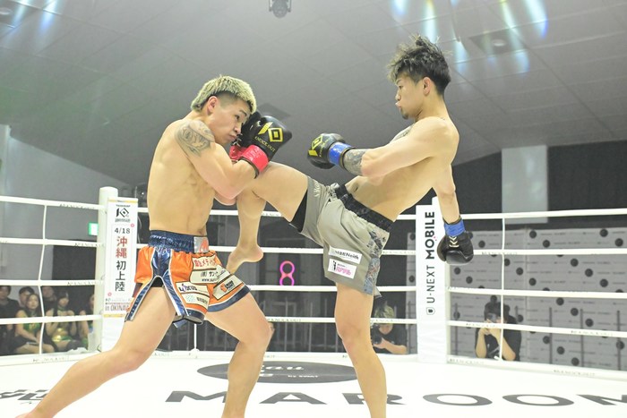 1R、力斗は左ミドル、左ミドルハイ、ワンツー。中島はよく見てじりじりと前に出ていくが、力斗は左右ミドルと前蹴り。中島の出鼻を狙う力斗はヒザ、ワンツー。中島の右ローには右ストレートを合わせに行く。中島は右フックで距離を詰めると左ボディ。