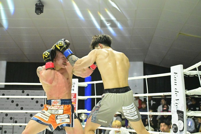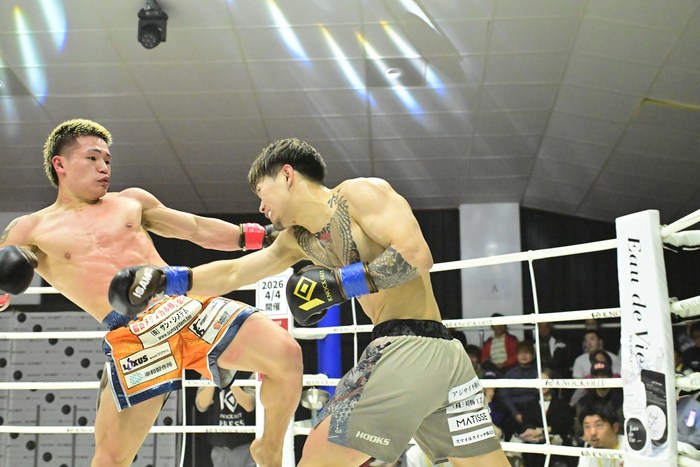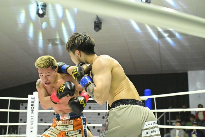 中島は左ボディから右フック、力斗も左フックを打ち返す。力斗が打ち合いに来ると中島も左右フックと左ボディ、ワンツー。中島が右ストレートを打って行くが力斗はかわす。