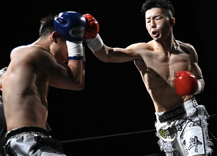 2R、偉武のパンチの連打をブロックしながら前進の止まらない杉本は左右フックを当てはじめ、打ち合いの中で右フックをクリーンヒットさせてダウンを奪う。杉本はラッシュを仕掛けるが、偉武も負けじと手数を出して終盤には右ストレートを連発させてヒットさせる。