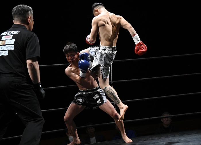 1R、異色なボクシングスタイルの杉本はガードを固めながらプレスをかけ左ミドル。偉武は回り込みながら手数を出して終盤にはテンカオを突き刺す。