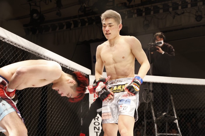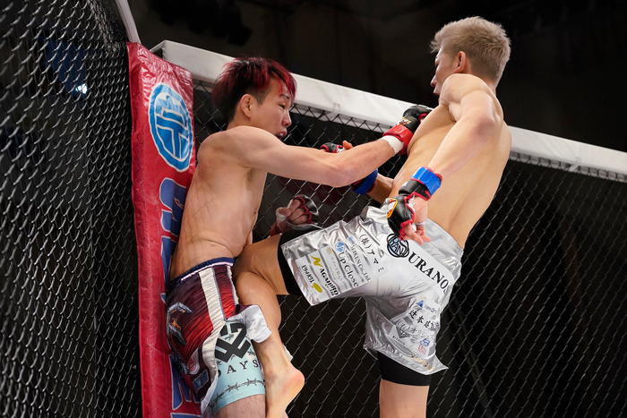 ケージに詰まった大原に左ヒザを突いて、金網づたいに回る大原を追って右をクリーンヒット。大原の右の打ち返しをかわして、ケージに詰めて左ヒザも、これが金的に入り、試合は中断。そのまま大原は試合に戻れず、規定により1R ノーコンテストとなっている。