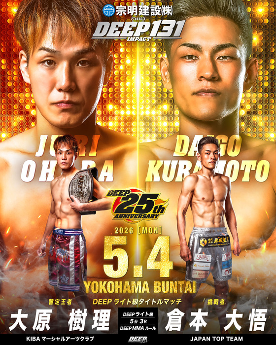挑戦者の倉本はフルコンタクト空手と柔道がベース。21年9月のBreaking Down 2を経て、22年9月にDEEPでプロMMAデビュー。24年3月のDEEPで川名雄生に判定勝ちすると、5月に北岡悟に1R TKO勝ちで5連勝。24年11月のRIZIN名古屋大会でRIZINに初参戦、キム・ギョンピョに1R TKO負けを喫したが、25年3月にトミー渡部に3R TKO勝ちで再起。11月の『DEEP 128 IMPACT』で大木良太を2R TKOに下して再び連勝街道に乗って暫定王座挑戦を決めていた。31歳。