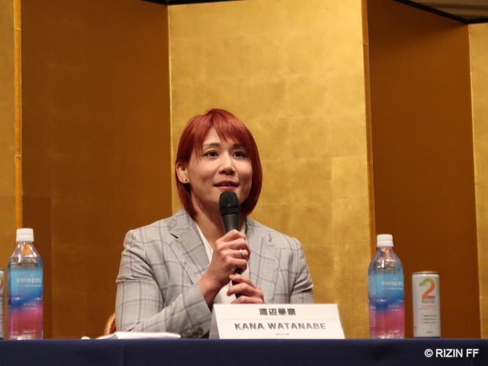 3月27日のRIZINの会見には、4月11日(日本時間12日)、米国イリノイ州シカゴのウィントラスト・アリーナで開催される『PFL Chicago: Pettis vs. McKee』で、PFL4勝1敗のパウリナ・ヴィシエフスカ(ポーランド)と対戦する渡辺華奈(FIGHTER'S FLOW)も出席。ともに意気込みを語った。