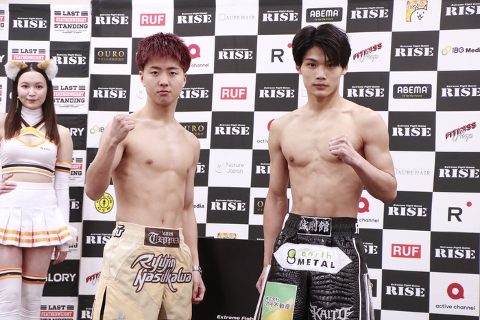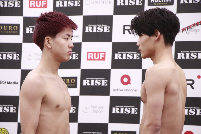 第11試合の第4代RISEスーパーフライ級(-53kg)王座決定戦3分5R延長1Rで対戦する、同級1位・那須川龍心(TEAM TEPPEN)と同級3位・長谷川海翔(誠剛館)は、共にリミットちょうどの53.0kgで計量をパス。
