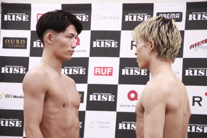 第10試合のSuperFight!-59kg契約3分3R延長1Rで対戦する、RISEフェザー級王者・安本晴翔(橋本道場)は58.9kg、第6代K-1 WORLD GPフェザー級王者・寺田匠(team VASILEUS)は58.95kgでそれぞれ計量をパス。