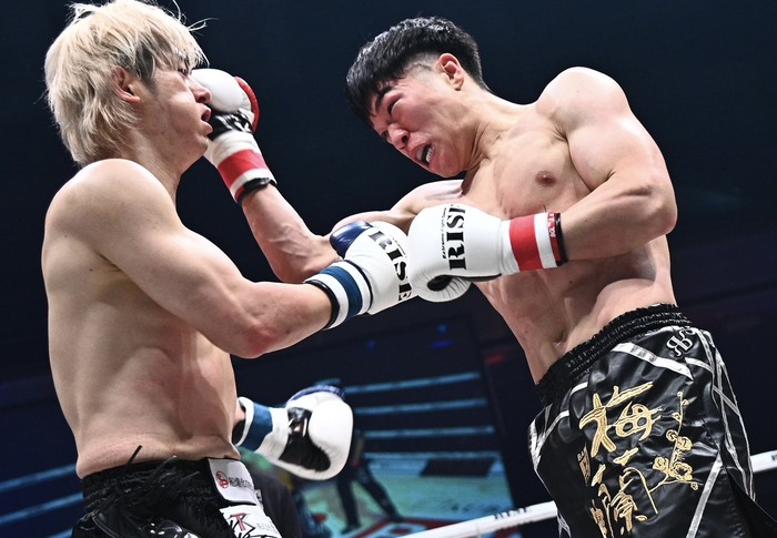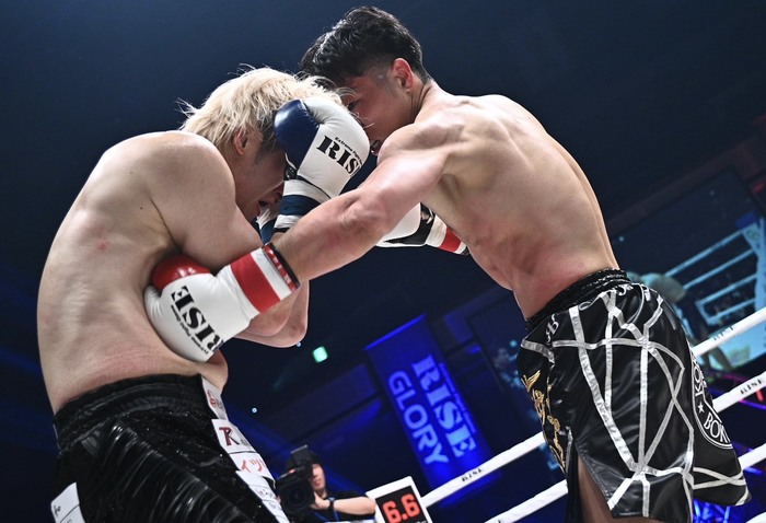 3R、前に出る髙木は崩しを交えながら前に出て右アッパー、左ボディ。稲井はジャブ、右ストレート、左右ボディを返すが髙木の身体の圧に押される。髙木が左ボディ、右カーフ。左ハイも蹴る髙木。右アッパーで稲井のアゴが跳ね上がる。左フックと左ボディを打つ髙木に右ヒザを突き上げる稲井。髙木が打ち合いを仕掛け、稲井もロープを背にして打ち合うが髙木の手数が優る。