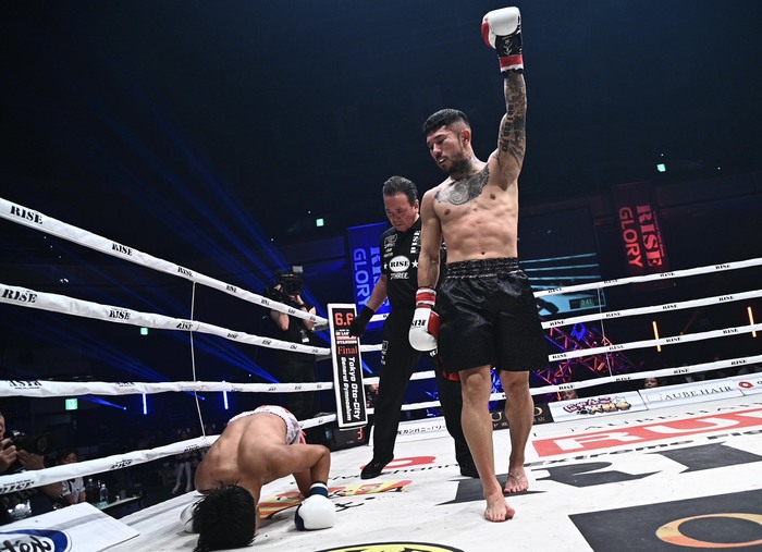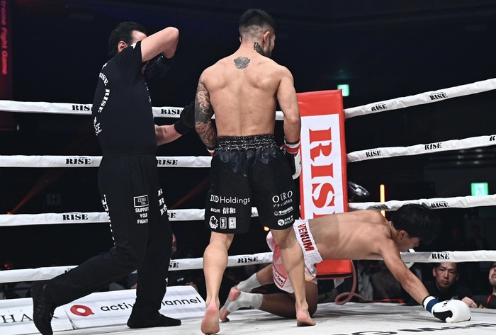 しかし、右ストレート、左カーフで下がらせた中村が左ヒザを突き刺すとペットエジアはダウン。最後は中村が左右ボディからの薙ぎ払うような左フックで仕留めた。