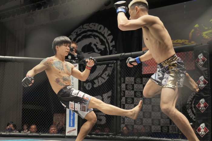 1R、サウスポー構えの杉本。オーソの高岡を詰めて左ハイ。ガードする高岡は右インローを当てる。杉本の右ローにバランスを崩した高岡を追う杉本は左右から左ヒジ。左ストレートに、高岡も右を突いて押し戻す。