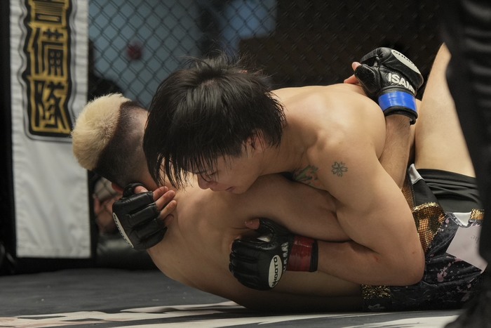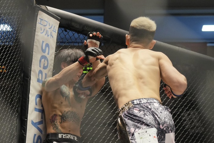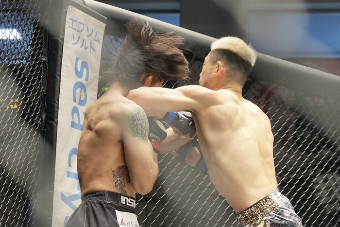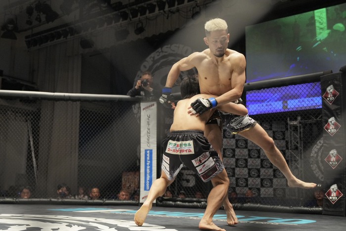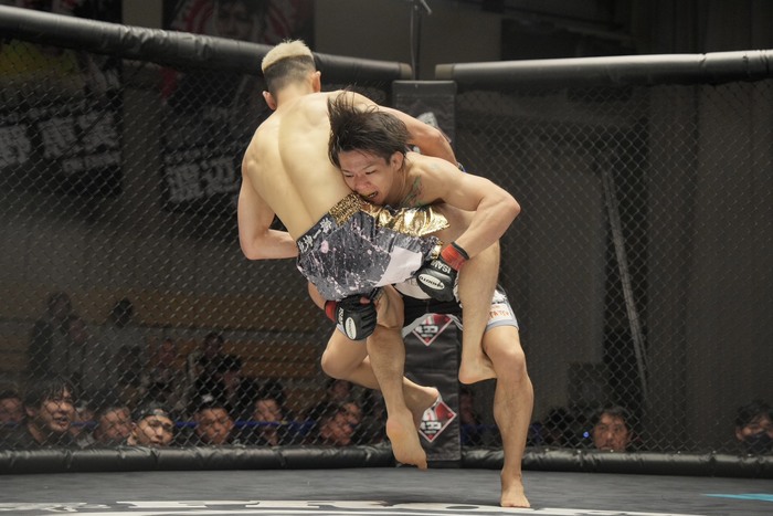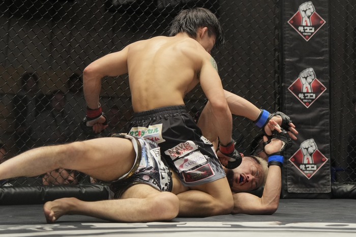 3R、高岡の入りに右前手アッパーの杉本だが、詰める高岡の右を被弾。クリンチアッパーの高岡はダブルレッグテイクダウンからバック! 両足をかけてリアネイキドチョークを極めた。
