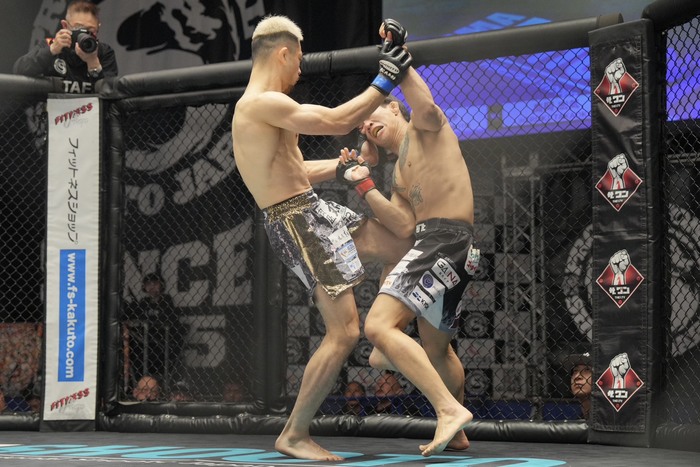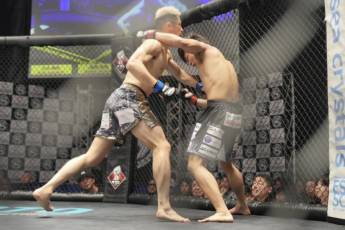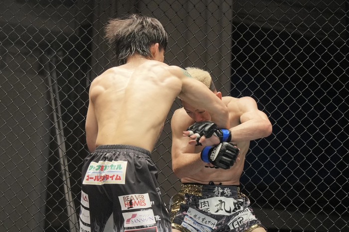 いきなり左を打つ杉本は右カーフも。その打ち終わりに組んだ高岡はバッククリンチから右足をかけるが右足を前にした杉本。背後からヒザ突く高岡は崩しに行くが投げられない杉本。再び右足をかけた高岡。杉本の右足を挟んで引き出し背後から右のパウンド。
