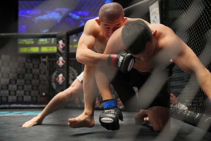 左ジャブの刺し合いから右を届かせた荒井。左右で前に出る沙門をシングルレッグで押し込みドライブ。