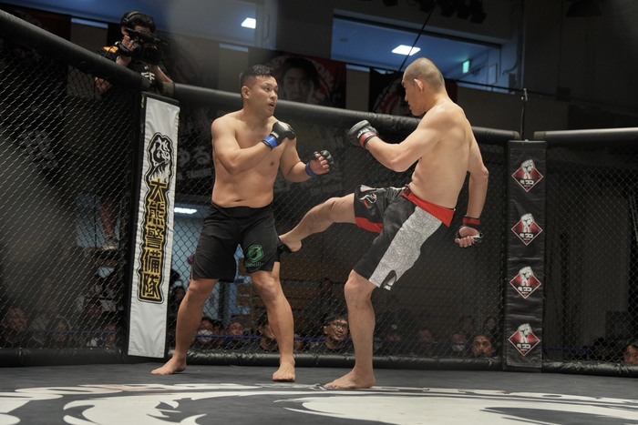 荒井のローブローを流した沙門だが、続く荒井の低いタックルに反則のサッカーキック。中断。沙門に「減点1」。詰める沙門だが残り10秒、荒井が組んで押し込みホーン。