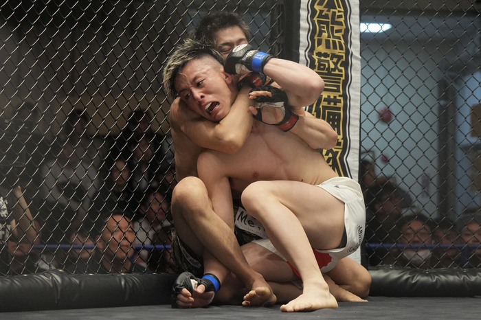 左インローの岡田。ワンツーの左で詰めるとそこに下がりながらダブルレッグの柴山だが、圧し潰した岡田の詰めに、ノーアームギロチンの柴山。絞めるが下にさせた岡田が上に。足を手繰りに来た柴山のバック、首を狙う岡田。抜けた柴山は立ち上がりも岡田がハイクロッチでテイクダウン。柴山は疲労したか。背中を着いて首を抱えて右踵を背中に突いて凌ぐ。岡田はハーフから固める。