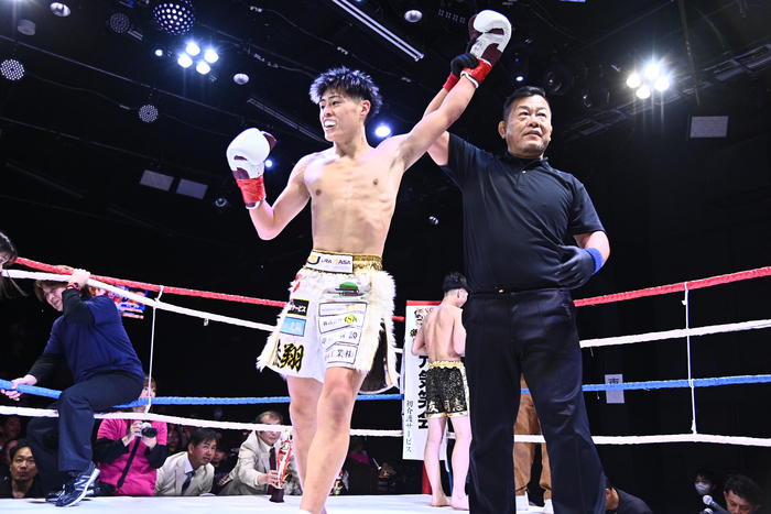 1R、右ストレート、左ボディブローを強打させる陸刃は左ジャブも的確にあていき右ハイでダウンを奪う。勢いに乗る陸刃は丸石をコーナーに詰めてパンチ連打で2度目のダウン奪取。最後もパンチを振り回してダウンを追加させてTKO勝ちした。
