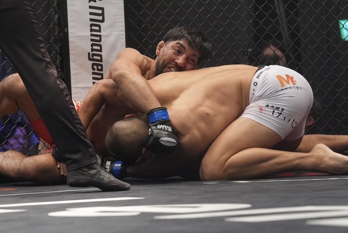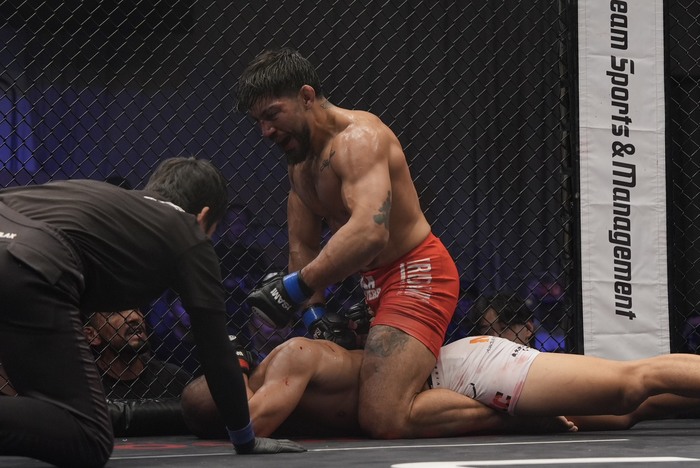 木下の右手首を後ろ手で掴んで縛って左でパウンドするバレンズエラ! 仰向けにも正対できない木下は右手を背中に回されたままうつ伏せに。マウントで右手を掴んだまま鉄槌を連打するバレンズエラ! 動けない木下を見てレフェリーがストップした。