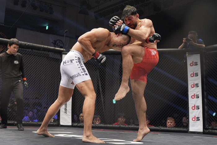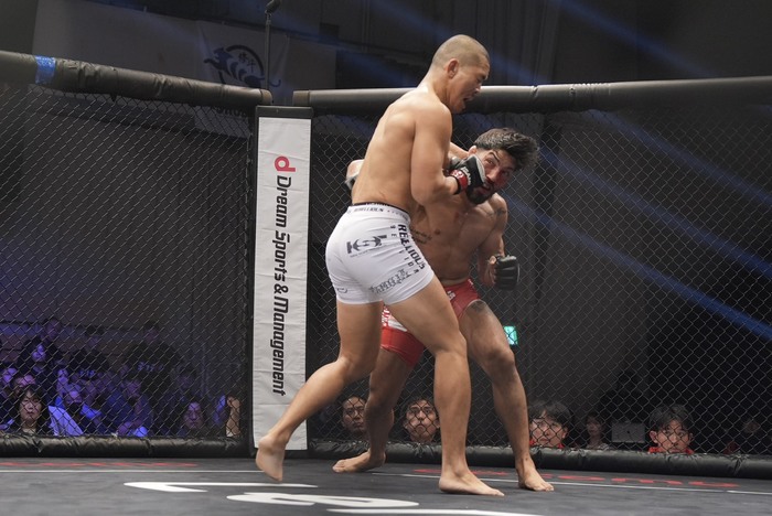 左右で入るバレンズエラに木下も左を打ち返すが、バレンズエラは木下の頭が下がったところに首相撲ヒザ。