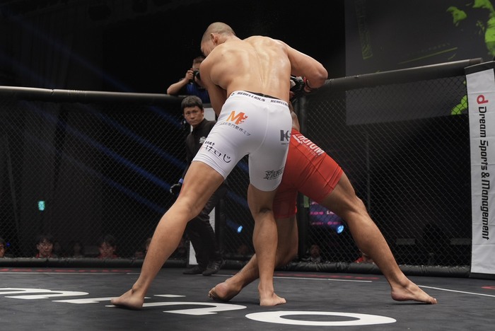 それを潜ってバッククリンチのバレンズエラは右足で木下の足元を崩してテイクダウン。足をかけせさせずに立った木下。その正対際にダブルレッグテイクダウンのバレンズエラは立とうとする木下の右足首を掴んで崩す。