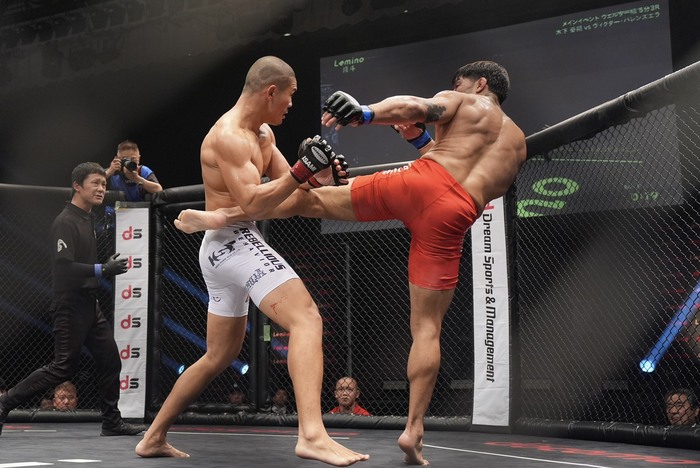 1R、バレンズエラの右ミドルを掴んでサウスポー構えから左を打ち込む木下。組むバレンズエラを突き放して左ハイ。ガードのバレンズエラは右ハイ。ガードの木下が詰めて右前手を狙う。前蹴りがローブロー。すぐに再開。