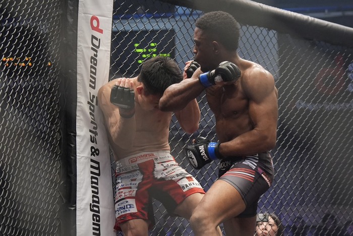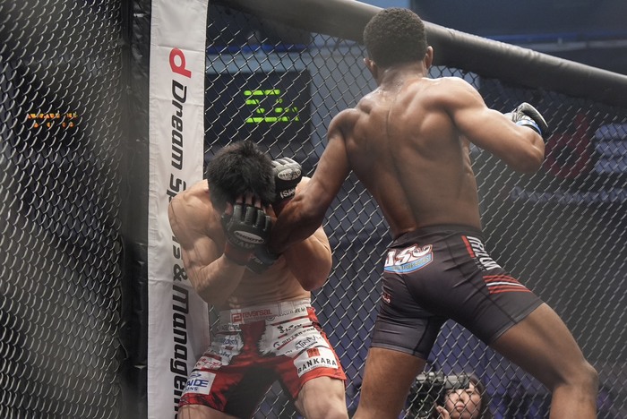藤田の組みを差し上げてケージに押し込みヒジ・ヒザ! さらに右ヒジ、左フックに藤田が崩れ、コンセイソンがパウンド。レフェリーが間に入った。