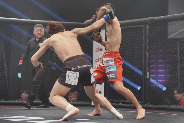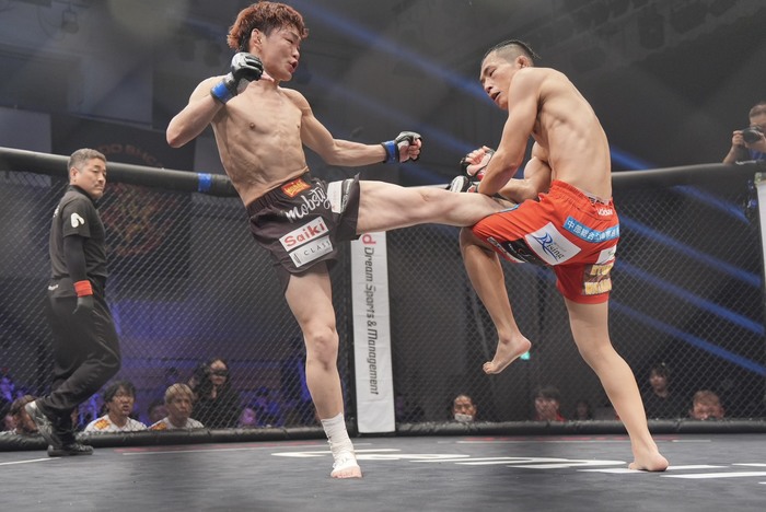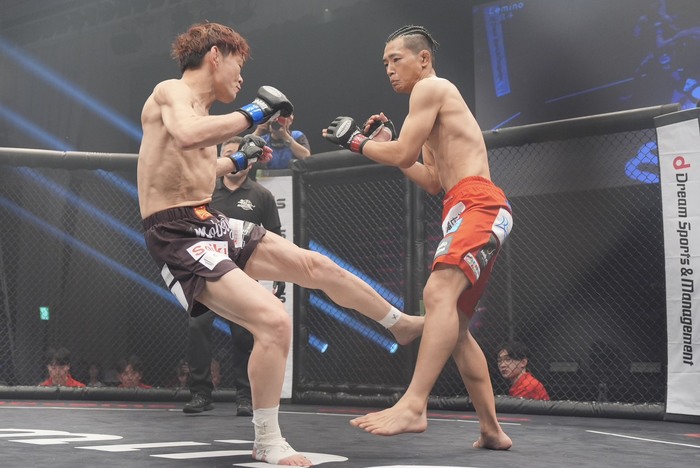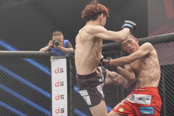 2R、ワンツーの内藤、右前手も突く。畠山は右のスーパーマンパンチ。かわした内藤をケージに詰めて上下に打ち分ける畠山。内藤も左をフック、ボディに。右ジャブを届かせる内藤。さらに左ミドルをヒット。右ローの内藤。左インローで足を2度飛ばす内藤。畠山の入りに左ストレートを当てる。