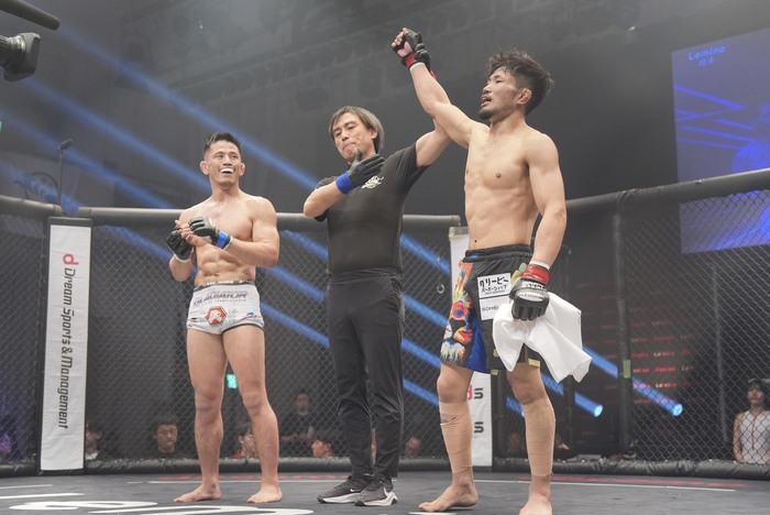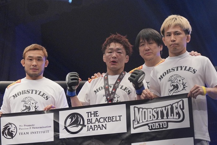 千葉と沖縄のTBJ同門対決判定2-0(29-28, 28-28, 29-28)で内藤が勝利。コールに噛み締めるような表情を見せた内藤だが、セコンドの鶴屋代表、扇久保の顔を見るとガッツポーズを見せた。