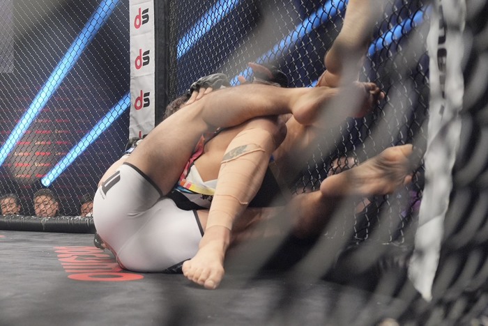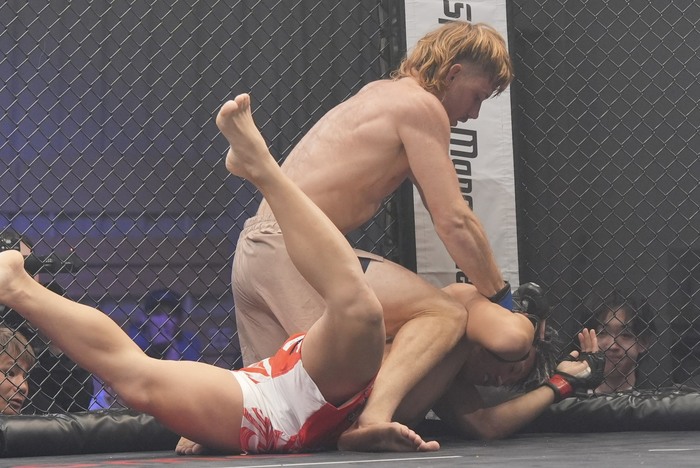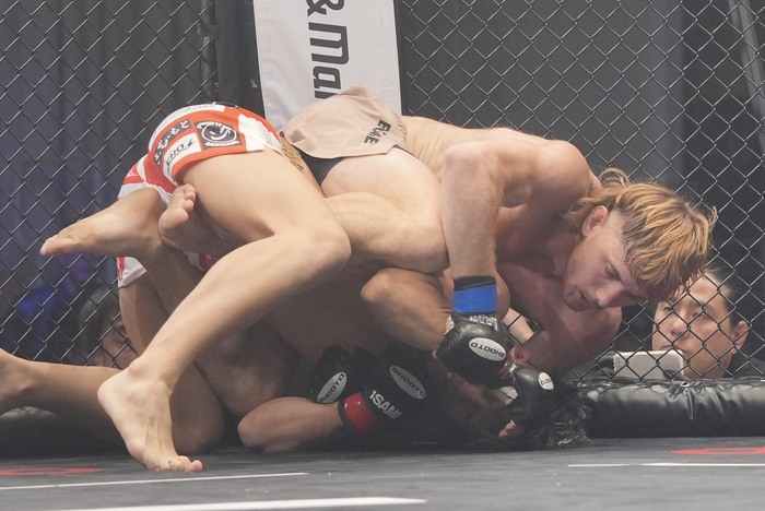 キムラクラッチを狙いつつ正対を狙う青柳は首を抱えてギロチンでトップに! ズラす神田はケージを使ってブリッジ仰向けに。なおもしつこくギロチンがぶり。それを外してダブルレッグから引き込んだ神田。ギロチンの青柳にハーフからバック狙い。青柳はハーフでギロチンを解きトップから細かいパウンドでホーン。青柳のラウンドに。