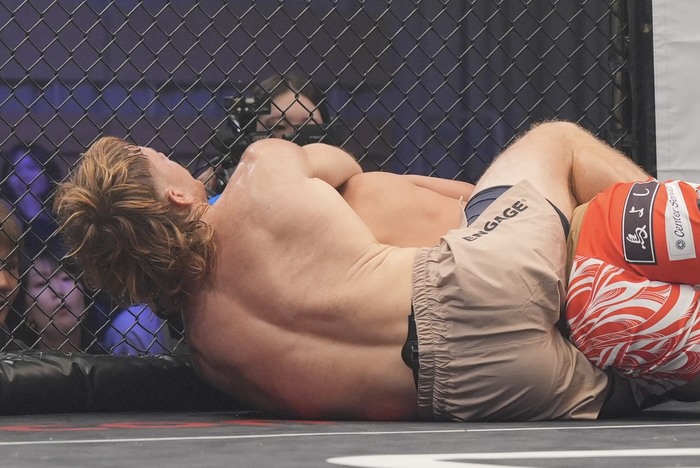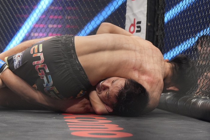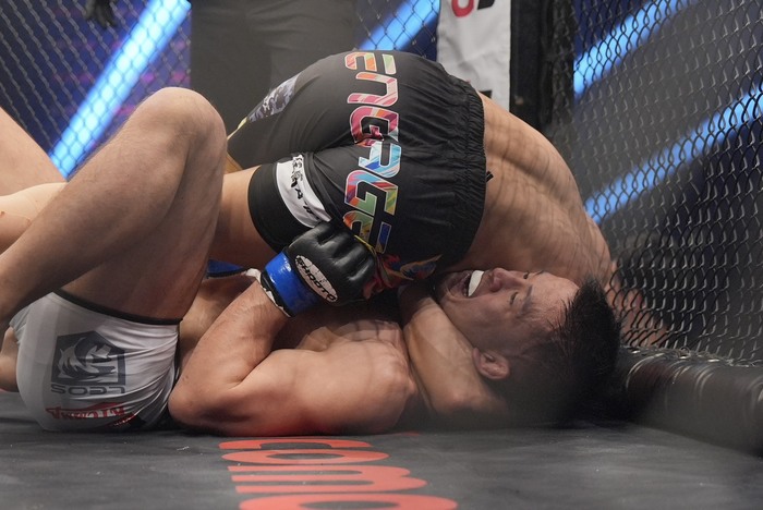 1R、サウスポー構えの宇藤に、オーソのマヨッキ。先にシングルレッグの宇藤。そこに首を抱えてがぶりのマヨッキは崩してバックに。首を狙いつつバックマウントに。右脇に重いパウンドを連打で放つマヨッキ。左腕を喉下に巻いて、リアネイキドチョークを極めた。