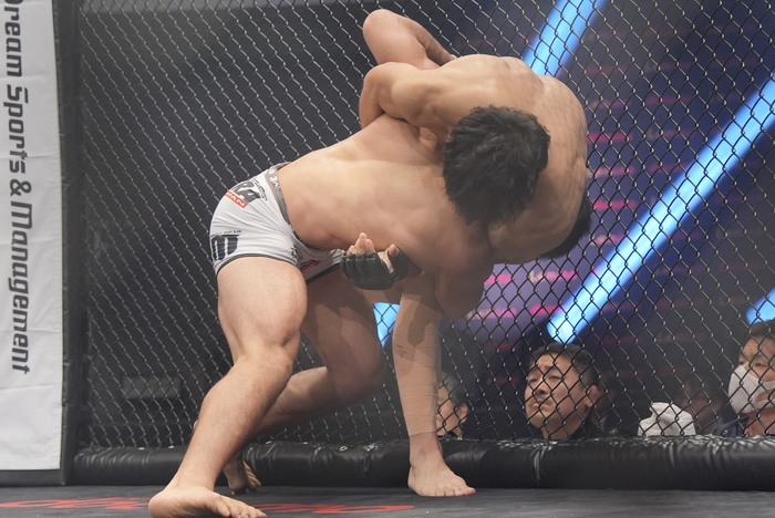 左ローの神田に、右ミドルの青柳は組んでバッククリンチ。キムラクラッチを組んだ神田。正対して四つに。体を入れ替えた神田はダブルレッグに切り替えるが、差し上げようとする青柳。テイクダウンした神田にすぐに立つ青柳。