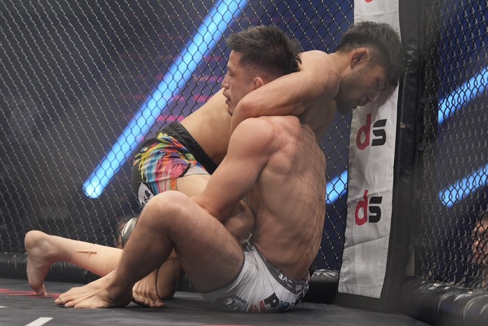 内藤は左ボディ狙い。畠山の詰めに内藤は左の連打も、畠山が右ストレートでダウンを奪う。クローズドガードで凌ぐ内藤は下からヒジ。背中見せてエスケープの内藤のバックに回る畠山。内藤は立ち上がりも、そこに首に腕を巻く畠山! ずらした内藤だがバックのまま。畠山はオタツロックも。ボディトライアングルの畠山。内藤は首を守る。