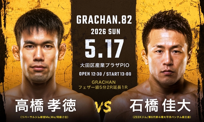 メインは、第6代修斗環太平洋バンタム級王者・石橋佳大(ZEEKジム)のGRACHAN初参戦。修斗で幾多の名勝負を繰り広げ「激闘王」の異名を誇る石橋が、GRACHANフェザー級2位・高橋孝徳(リバーサルジム新宿Me,We)とフェザー級で対戦する。