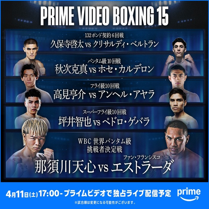 那須川天心(帝拳)vs.ファン・フランシスコ・エストラーダ(メキシコ)のWBC世界バンタム級挑戦者決定戦が2026年4月11日(土)東京・両国国技館『Prime Video Boxing 15』にて行われ、同大会をPrime Videoが独占ライブ配信する。「Prime Video Boxing」はAmazonプライム特典対象のライブ配信。