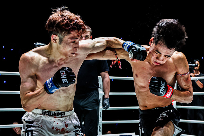 右ローを集中的に蹴るパヤクルトはいきなりの右ストレート、ヒジを打つが一航はかわす。縦ヒジ、飛び込みのヒジで前に出るパヤクルトが左ヒジをヒットさせ、一航を流血に追い込む。
