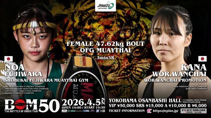 第10試合の-47.62kg契約OFGムエタイ3分3Rで対戦する、藤原乃愛(尚武会フジワラムエタイジム)は47.34kg、カナ・ウォーワンチャイ(ウォーワンチャイプロモーション)は47.36kgでそれぞれパス。