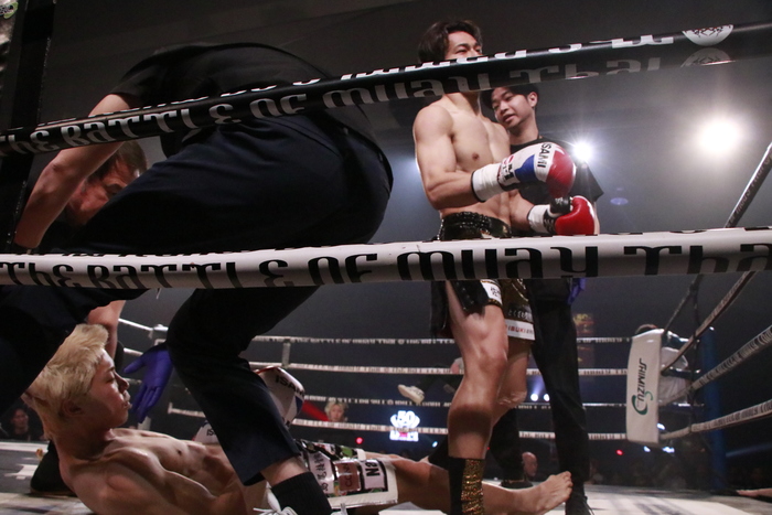 1Rが始まってすぐ打ち合いに行った廣野に林が右フックでダウンを奪う。続いての出会い頭にも林が右フックを強打し、全身が硬直した廣野は担架で運ばれた。