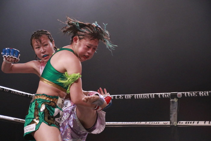 2R、藤原は組み際のヒジと組んでのヒザで勝負をかけるが、カナがパワーでロープへ押し込んでいく。カナが入り際の右フック、さらに藤原のお株を奪う顔面前蹴り。藤原は首相撲で抑え込んではいるが攻撃の数が少ない。