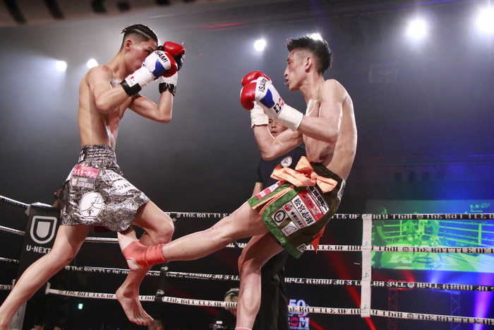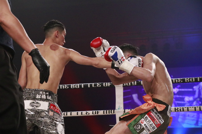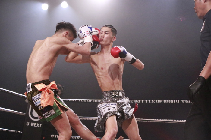 2Rもカーフを蹴っていく山脇にパンチで対抗するJOHだったが、山脇の右から左フックをもらって山脇に抱き着き、これがダウンとなる。山脇はワンツー、右フック。JOHも前へ出て左ストレート、左ヒジを狙っていく。