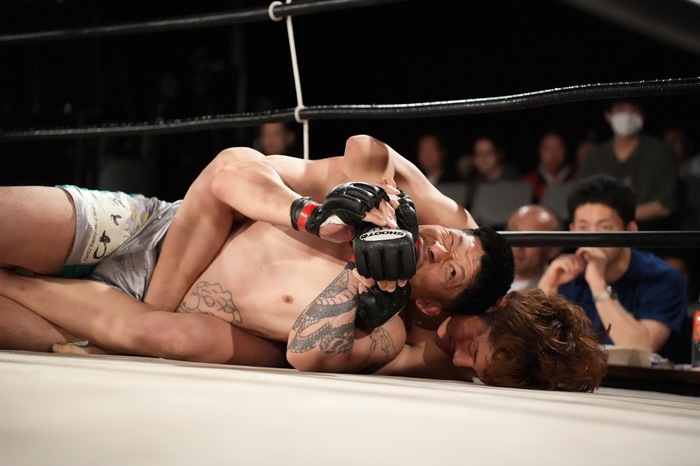 右足をかけて引き込んだ鈴木。下足を腹に巻いて置いて上の左足とボディトライアングル! 座りまで戻す佐々木の背後からパウンド。腕を手繰り脇潜る佐々木は、鈴木のおたつロックを外しに行くが、外せない佐々木。手首をコントロールする鈴木は足を組み直して背後からパウンド、リアネイキドチョークへ。腕を上に上げて正対しながらパンチを放つ佐々木だがゴング。